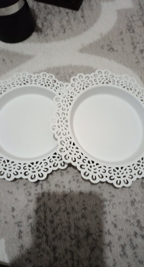 Beyaz, dantel desenli kenarlara sahip tabak seti. Düz yüzeyi ve klasik tarzıyla sofranıza zarif bir dokunuş katar. ️