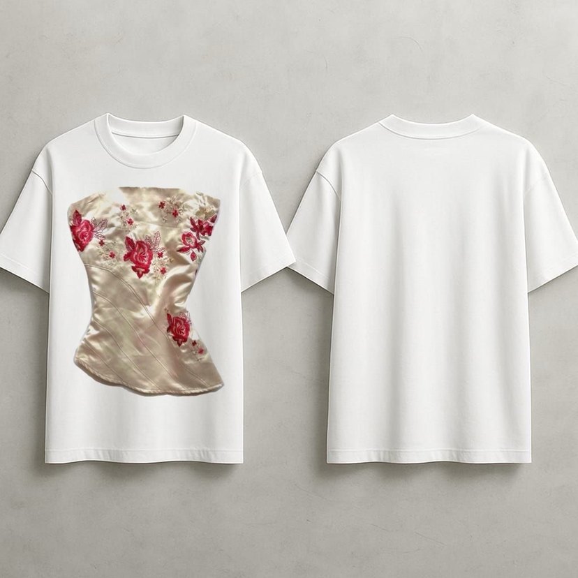 Beyaz renkli, dantel detaylı çiçek baskılı, kısa kollu, yuvarlak yakalı, salaş kesim kadın tişörtü. Sokak modasına uygun rahat bir tasarım.