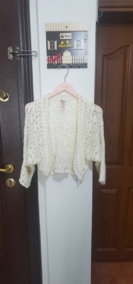 Krem renkte, dantel detaylı, bol kesim ve uzun kollu triko hırka. Bohem tarzını yansıtan midi boyda, günlük kullanıma uygun rahat bir üründür.