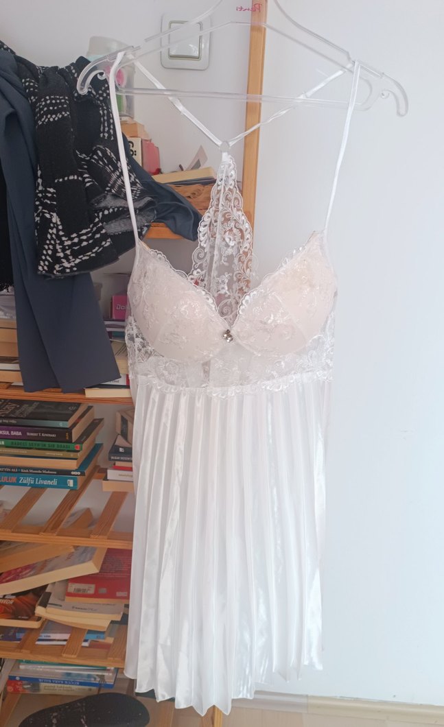 Beyaz renkte, dantel detaylı, askılı bohem tarzda, vücuda oturan midi uzunlukta geceliktir.