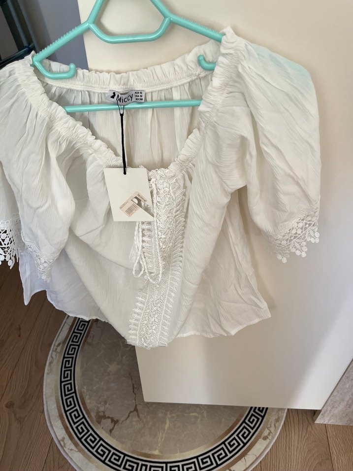 Pamuklu, kısa kollu, beyaz mini bluz. Bol kesim, işlemeli desen ve dantel detaylarıyla bohem tarzda.