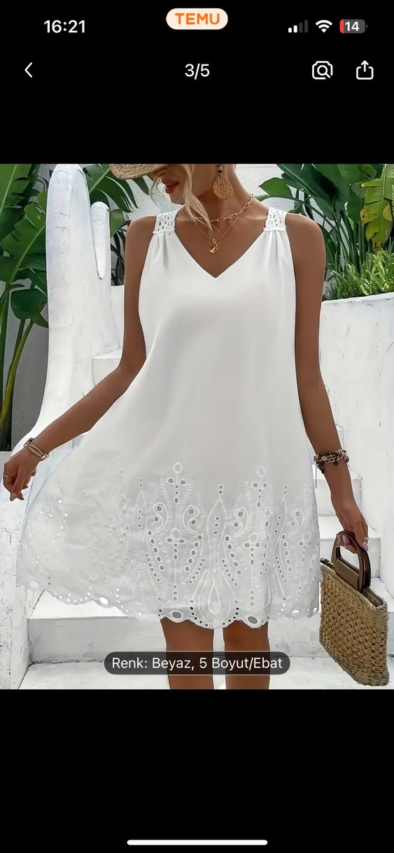 V yaka, dantel işlemeli beyaz, kolsuz, bohem tarzda, bol kesim mini elbise. Günlük kullanıma uygun.