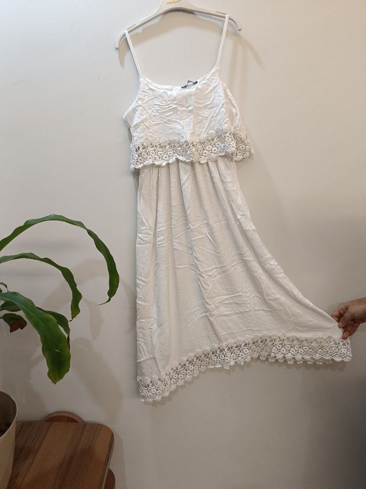 Pamuk kumaştan, dantel ve nakış detaylı, ince askılı, straplez yaka bohem tarzda beyaz uzun elbise. Rahat ve bol kesim.az kullanılmış tertemiz marka temsili
