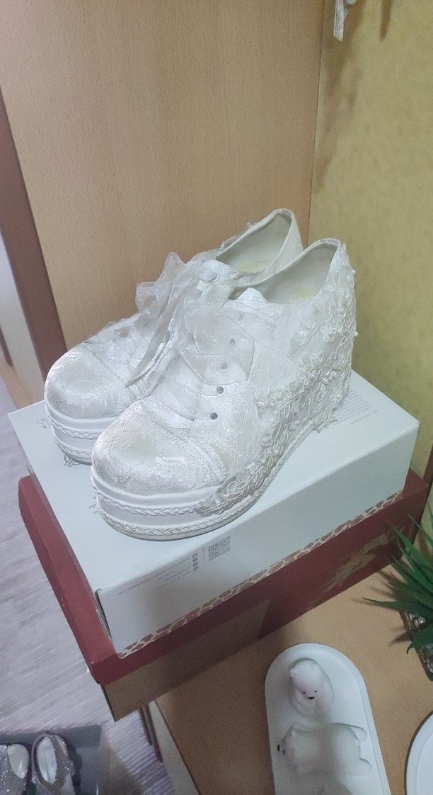 Dantel detaylı beyaz dolgu topuk kadın spor ayakkabı, vintage tarzda ve düğünler için uygun, kauçuk tabanlı.