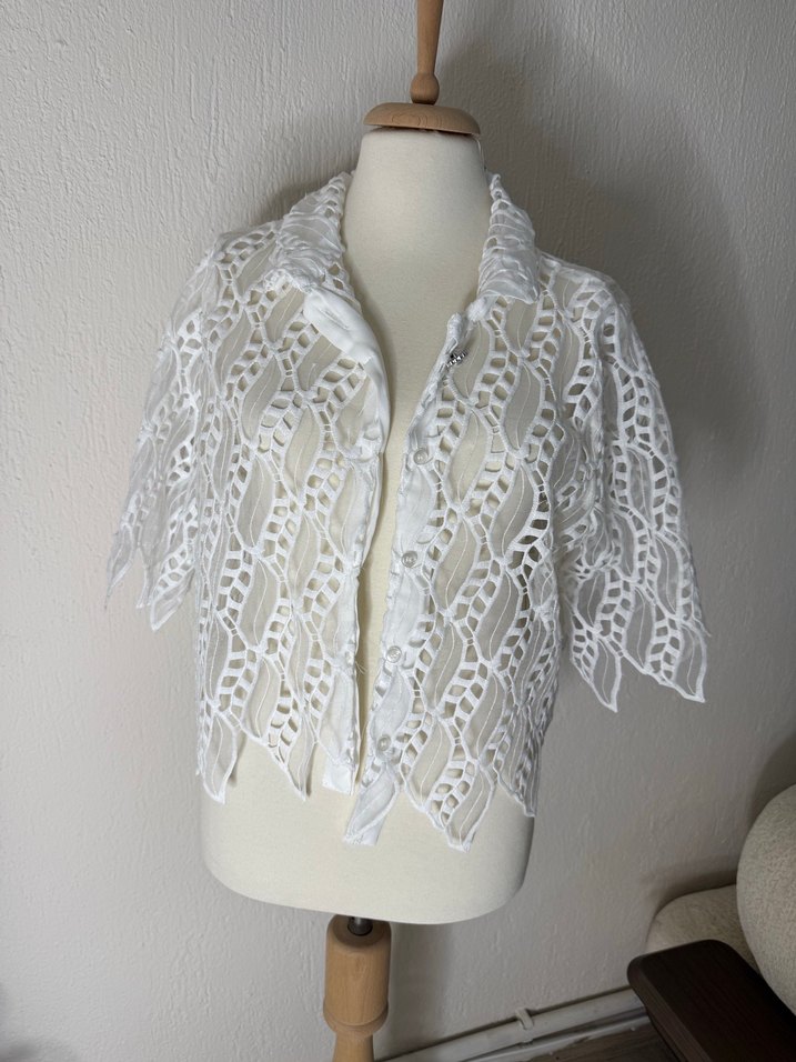 Dantel detaylı, yakalı ve kısa kollu beyaz Nakışlı desenler ve bol kesim bohem tarzı ile öne çıkar.