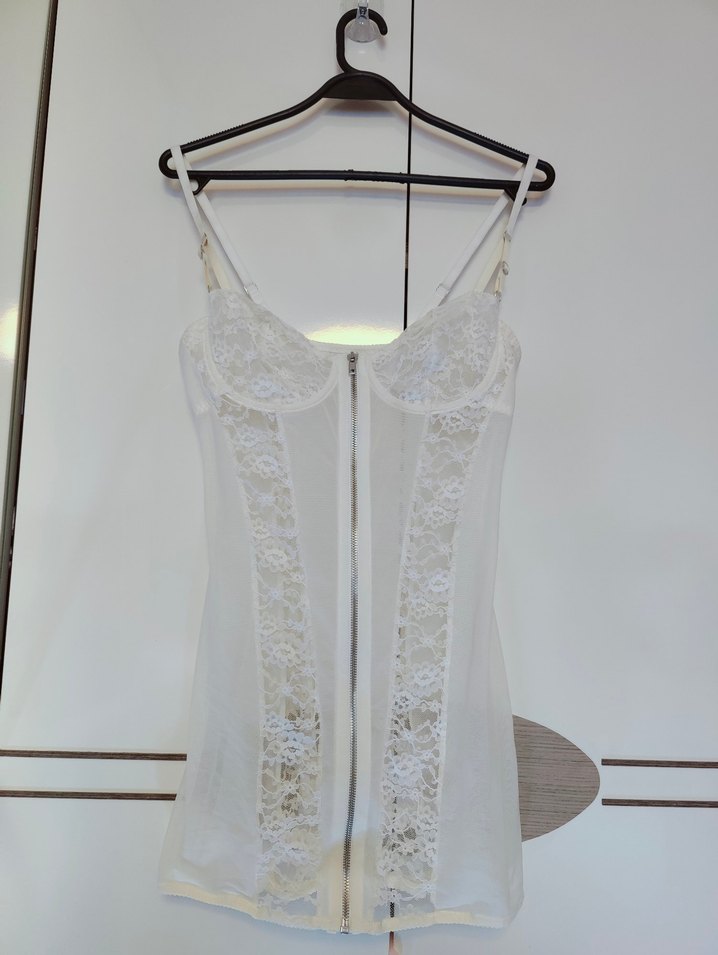 Dantel detaylı, ön fermuarlı beyaz hemşire korsesi. Midi boyda, ince ve vücuda oturan kumaştan üretilmiştir. L beden