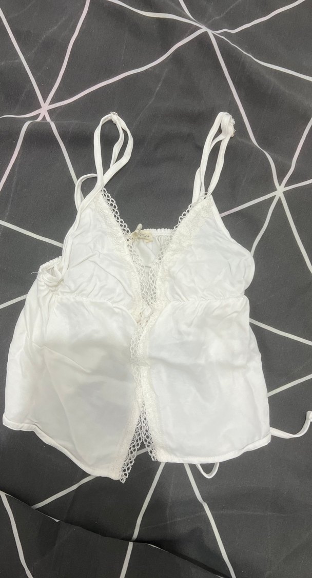 İp askılı ve dantel detaylı, beyaz renkli, satenimsi kumaştan yapılmış, normal midi boyda ve bohem tarzda fitted büstiyer.S beden Pull and Bear markası