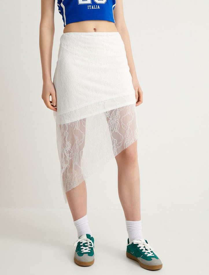 Beyaz Dantel Detaylı Kadın Midi Etek