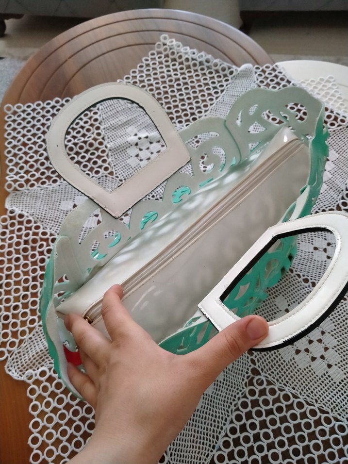 Beyaz renkli, dantel desenli plastik malzemeden yapılmış, bohem ve avant-garde tarzını yansıtan kadın çantası, günlük kullanım için uygundur.