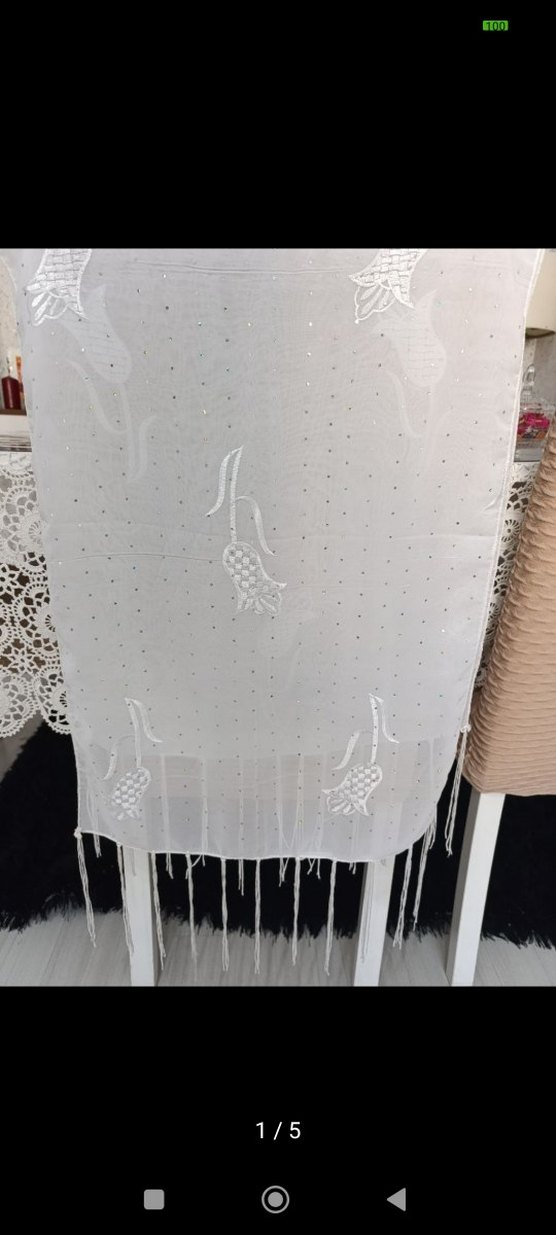 Sentetik kumaştan, beyaz dantel detaylı, tarzda, ince püsküllü kadın şalı. parlak detayları mevcut