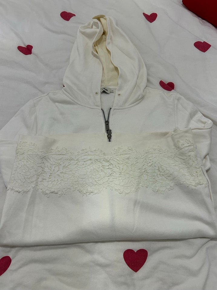 Pamuklu kumaştan, uzun kollu, yuvarlak yaka ve bol kesim beyaz sweatshirt. Sırt kısmında nakışlı dantel detayı bulunur. Kısa boyu ve rahat kesimiyle şık ve rahat bir secenek kordonu yok bazanın altında durduğu için sararmaları var yıkanınca geçer o yüzden fiyatı uygun