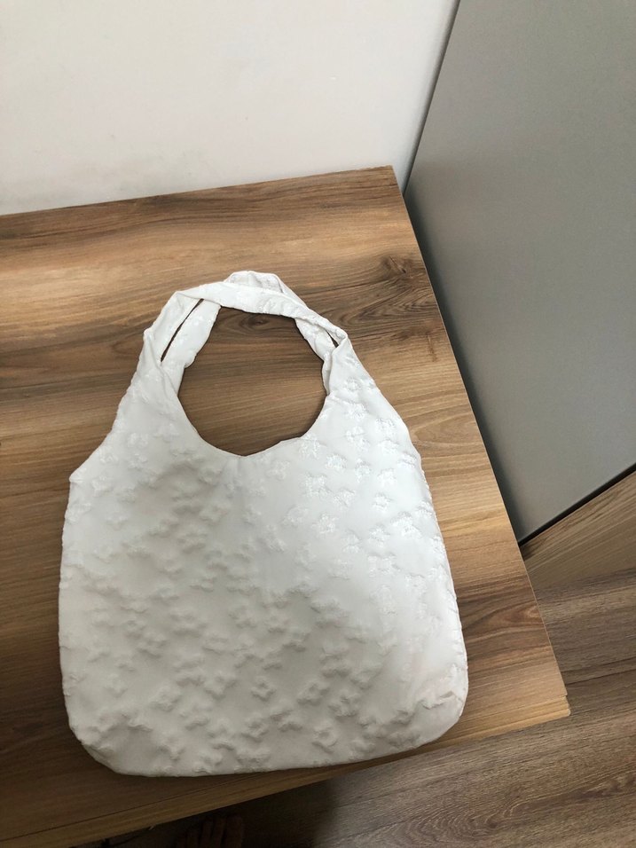 Beyaz keten kumaştan, dantel detaylı, sade ve bohem tarzda kadın çantası. Günlük kullanıma uygun pastel renkte, desensiz tasarım.