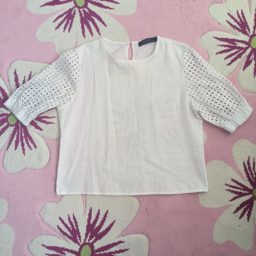 Pamuklu, kısa kollu, yuvarlak yakalı beyaz bluz, delikli kolları ve rahat kesimiyle günlük kullanıma uygundur. S ve m beden için uygundur. #kadın #tişört #bluz #beyaz