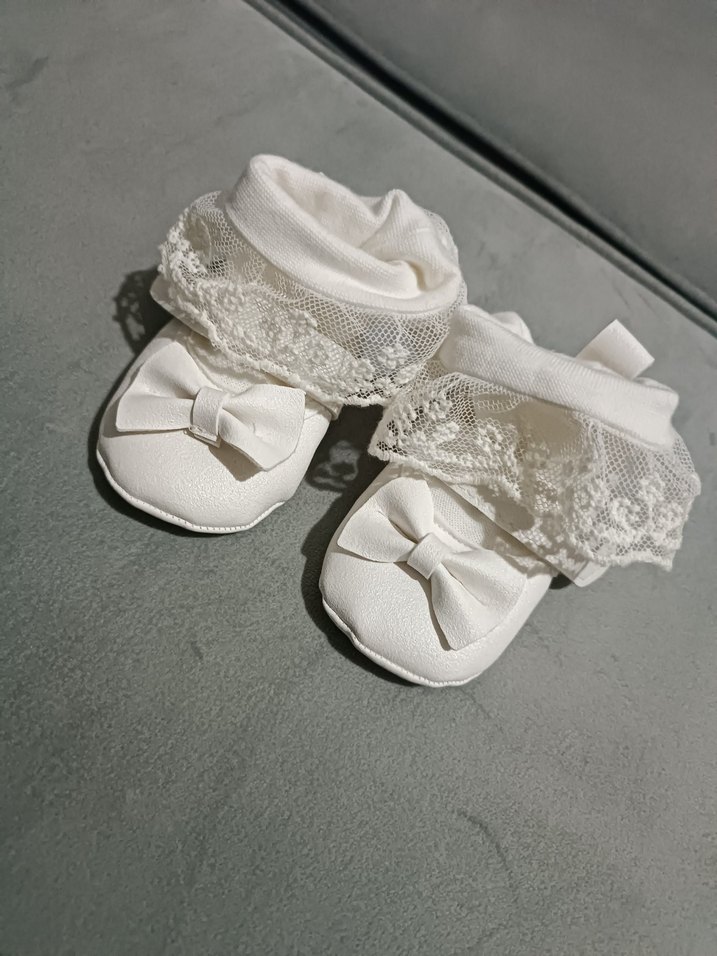 Beyaz renkli, dantel detaylı ve nakış işlemeli triko kumaştan kız bebek ilk adım ayakkabısı. Klasik tarzda, şık fiyonk süslemelidir.