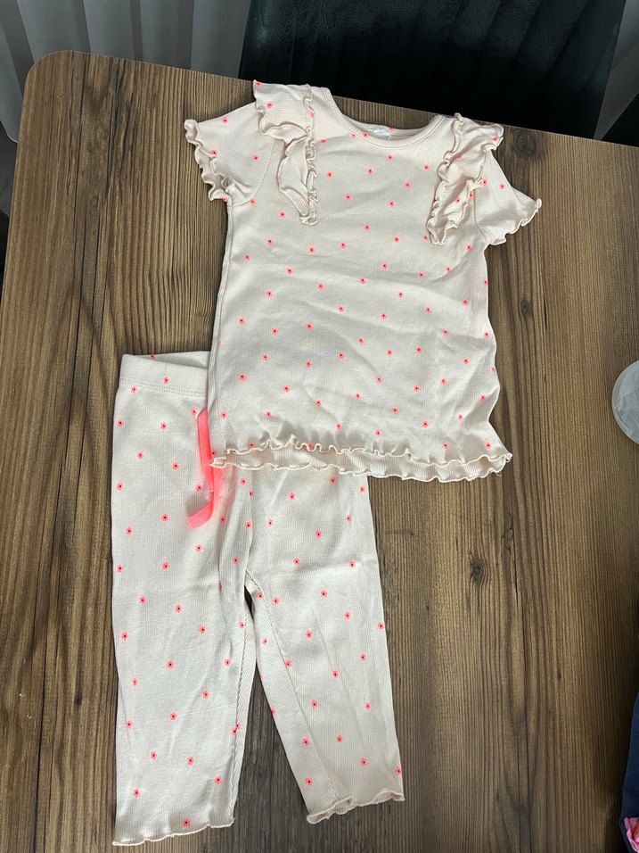 Beyaz kısa kollu üst ve benzer pantolondan oluşan, pastel pembe baskılı ve dantel detaylı yumuşak kız bebek takımı. 3-4 yaş LCW marka temiz üründür.