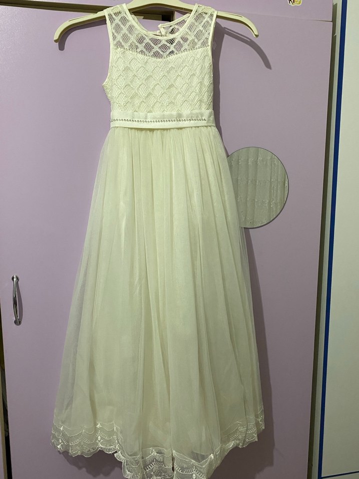 9-10 yaş 2 kere giyilmiştir hiç bir sorunu yoktur.Dantel ve nakış detaylı.