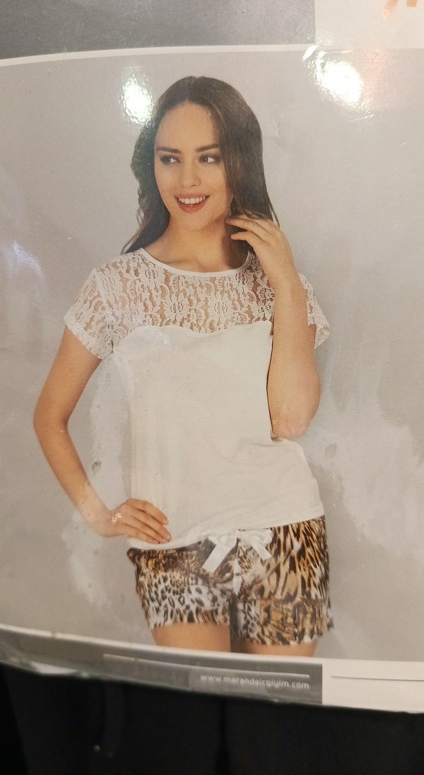 Beyaz Dantel Detaylı Leopar Desenli Kadın Şortlu Pijama