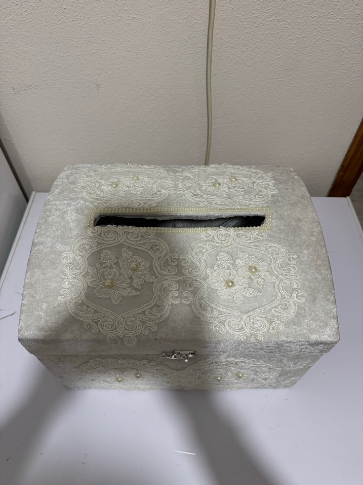 Dantel detaylı, üst kısmında para veya kart için açıklığı olan beyaz makyaj organizer kutusu, kilitli kapaklı. Biz düğünde para ve çeyiz sandığı olarak kullandık. İçimize yaradı.