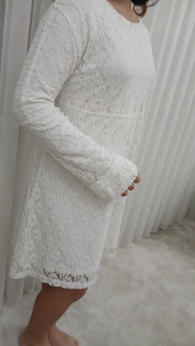 Beyaz renkte, yüksek yakalı, uzun kollu ve dantel detaylı triko elbise. Midi boyu uygun kesim.