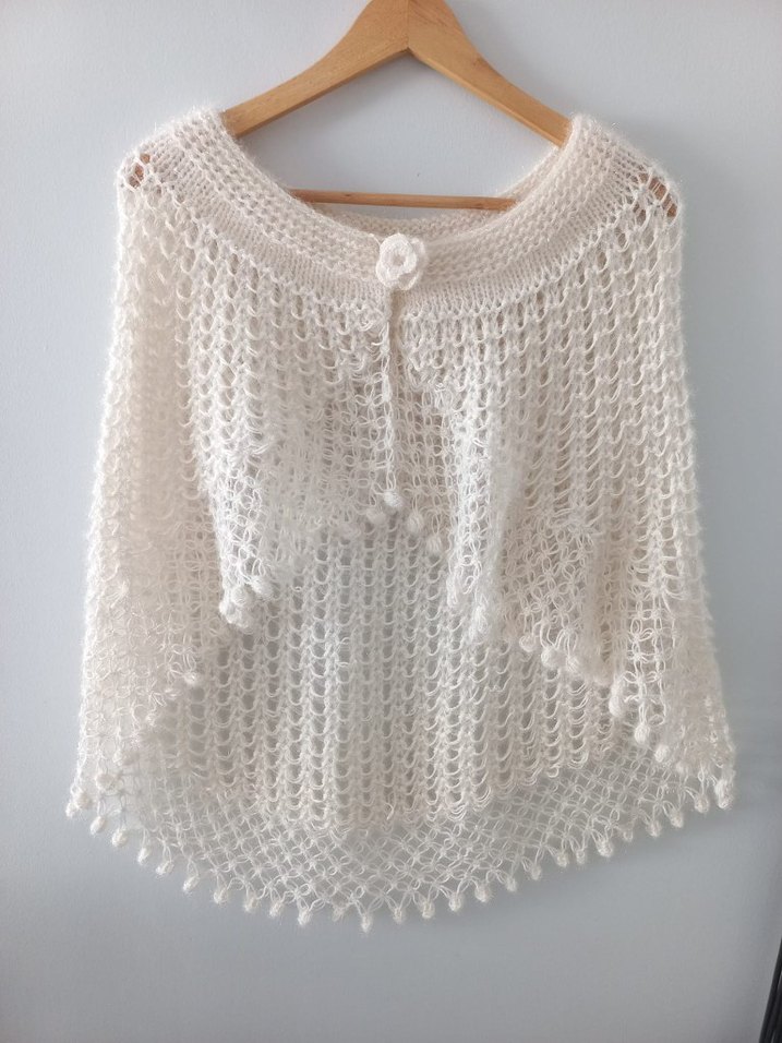 beyaz renkte kayık yaka örgü panço. Kolsuz ve bohem tarzda tasarlanmıştır.