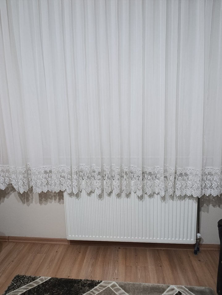 Alt kısmı dantel detaylı beyaz perde, hafif ve ferah bir görünüm sağlar. en 3,40cm.boy (tavandan-petek olan bölüm) 2,00cm.yırtık sökük yok fazlalıktan satıyorum.