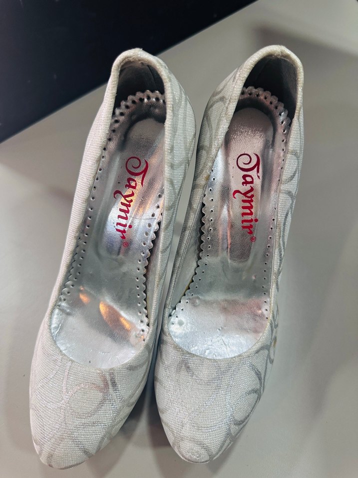 Dantel detaylı ve yılan desenli beyaz stiletto topuklu ayakkabı, düğünler için uygun. Kauçuk malzemeden yapılmıştır, klasik ve şık bir tasarım sunar.