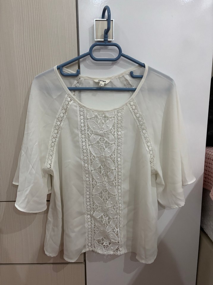Beyaz renkli, kısa kollu, bol kesim ve işlemeli dantel detaylara sahip