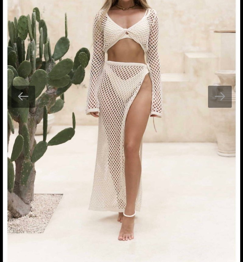Beyaz renkte, dantel detaylı, bohem tarzda, uzun ve vücuda oturan örme kumaş etek. Açık hava kullanımına uygun.