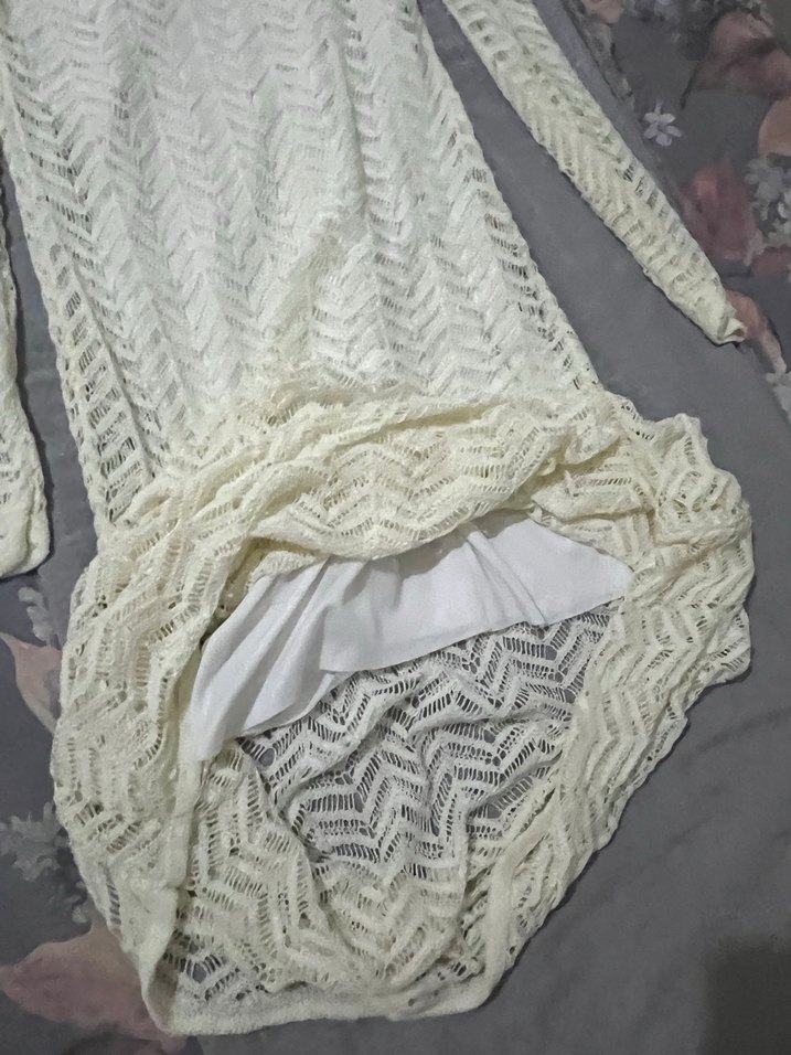 Beyaz renkte, dantel detaylı, uzun kollu ve tekne yaka kadın triko elbise. Sentetik kumaştan, bohem ve retro tarzda, günlük kullanım için uygun.