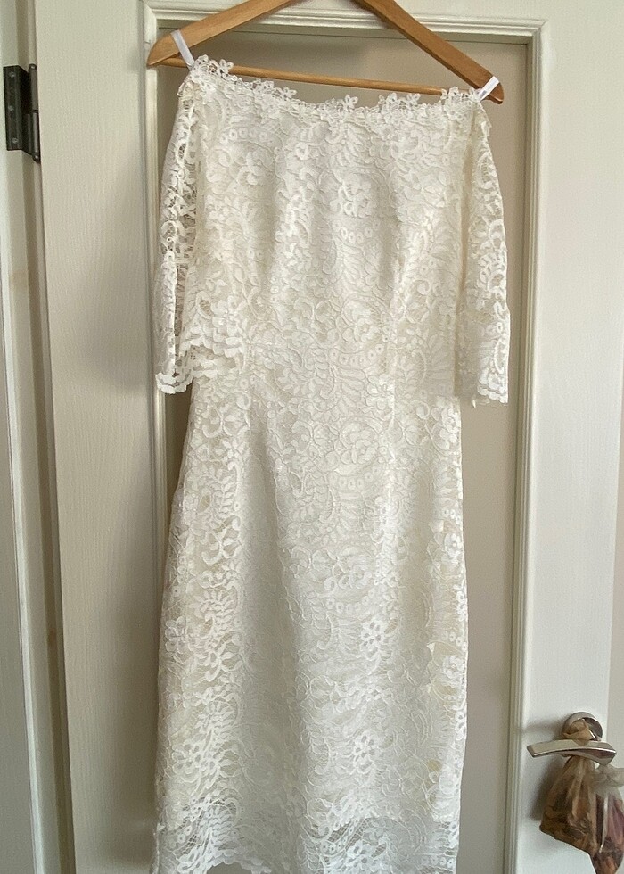 Oğlumun sünnetinde sadece 1 defa giyildi, dantel boyu omuzdan 103 cm geliyor ben 160 cm boyundayım bana dizimin altında oldu markası Fever, altında aynı renkte astarı var