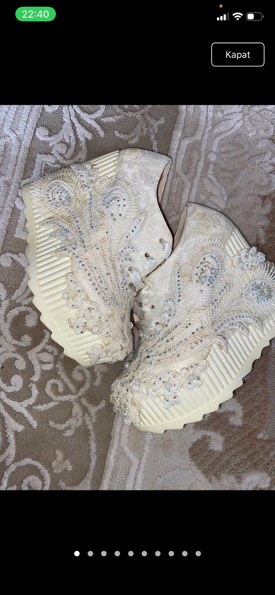 gelinlik ayakkabısı Dantel ve işleme detaylı beyaz dolgu topuklu ayakkabılar, tekstil malzemeden, düğünler için uygun avant-garde tarzda, şık ve trend.