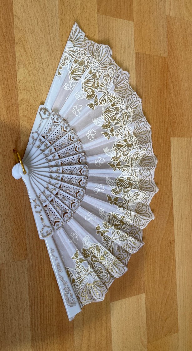 Altın kelebek desenli beyaz dantel yelpaze, hafif ve dekoratif. Zarif bir dokunuş için uygundur.