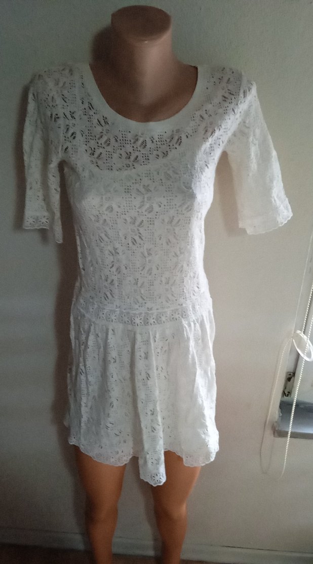 Beyaz dantel detaylı, kısa kollu, bol kesim midi elbise. Yumuşak triko kumaştan, yuvarlak yakalı, düğün için uygun.