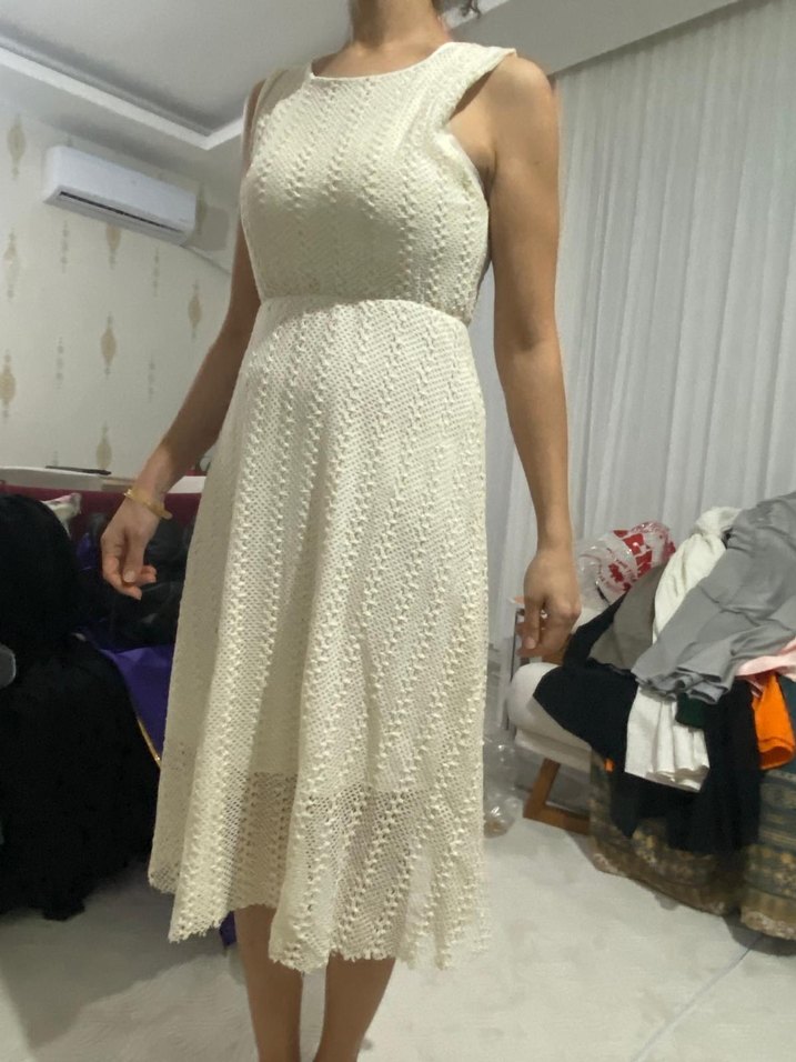 Kolsuz, dantel kumaştan beyaz midi elbise. İnce ve oturan kesimiyle klasik ve bohem tarzı yansıtır, düğünler için uygundur.