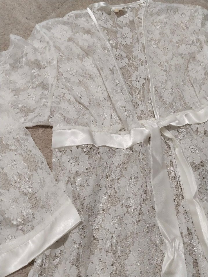 Beyaz dantel midi sabahlık, ince askılı kollu ve bol kesimli, yumuşak saten kemerle tamamlanmış, rahat bohem tarzda.