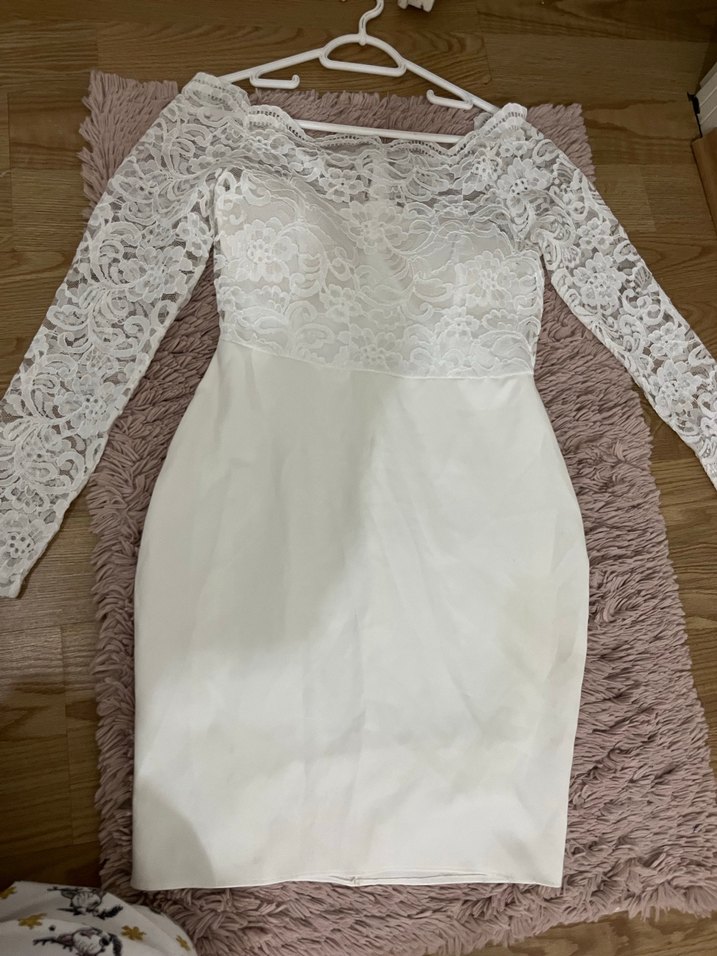 Beyaz dantel uzun kollu ve straplez yakalı, vücuda oturan midi boy elbise. Modern klasik ve şık tasarım, düğün için uygun. SHİNE İSTANBUL MARKA