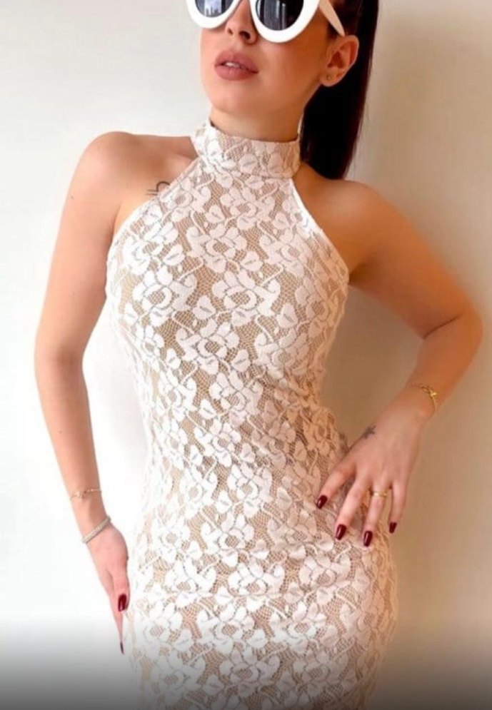 Beyaz dantel kumaştan, yüksek yakalı ve ince askılı, vücuda oturan mini elbise. Hafif yılan deseniyle, gösterişli parti kombinleri için uygun.