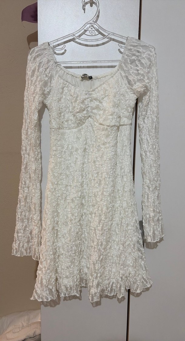 Ürün etikette L beden gözüküp likralı olmasından kaynaklı s beden gibidir. Beyaz dantel kumaştan, uzun kollu ve vücuda oturan mini elbise. Kalp yaka ve bohem tarzda, retro ve hippie havası taşıyor. ✨