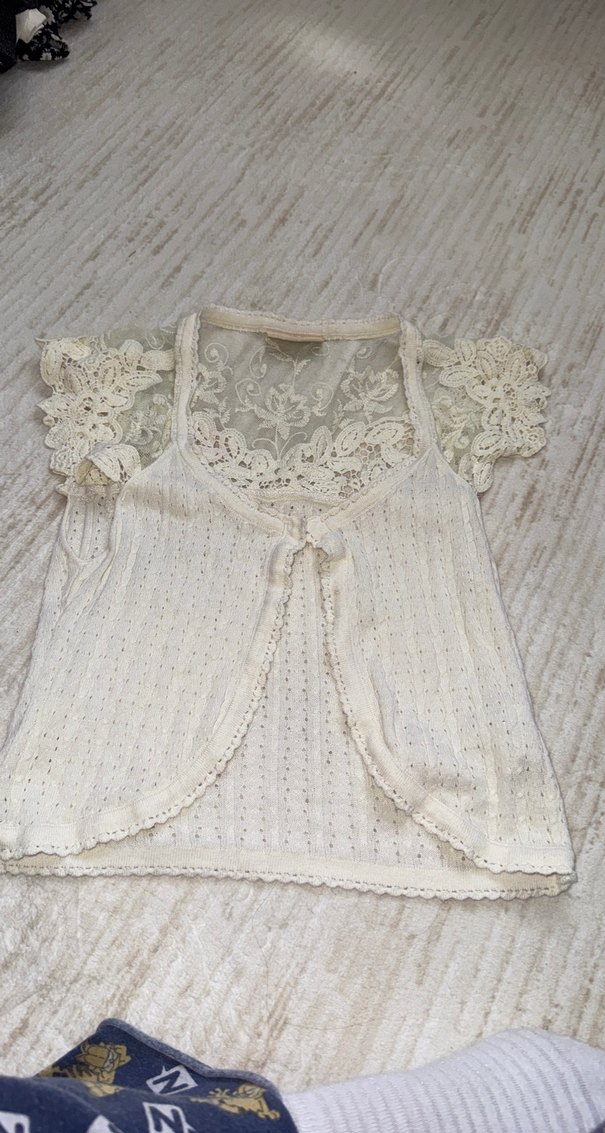 Beyaz renkte, dantel nakışlı, straplez yakalı, ince örme kumaştan yapılmış, bohem tarzda kız bolero.