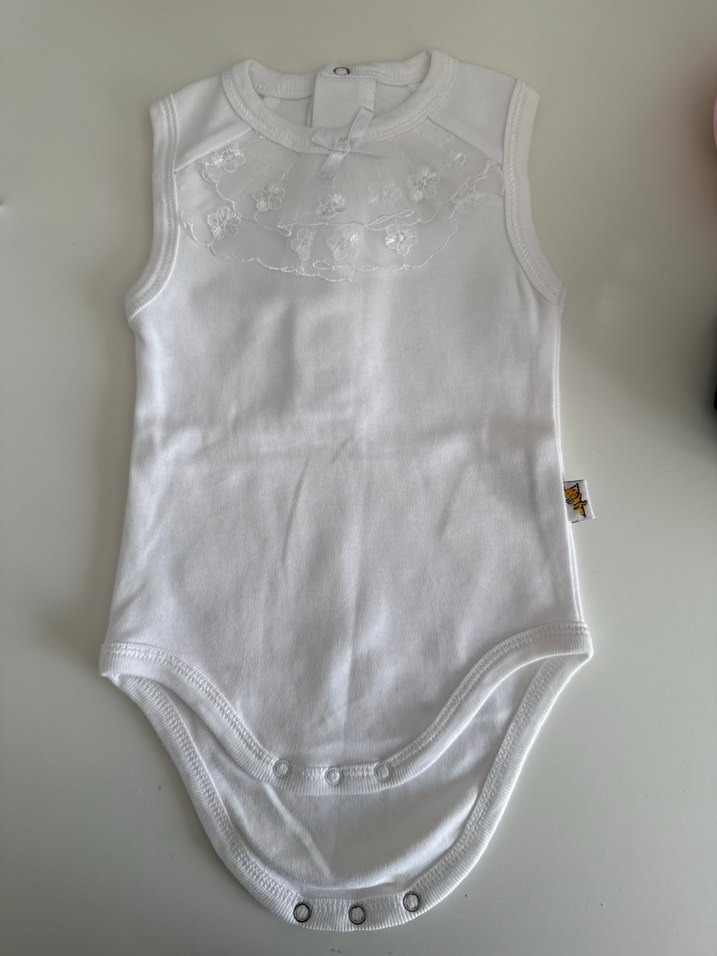 Kolsuz, beyaz renkli bebek body. Dantel ve nakış detaylarıyla süslenmiş, yuvarlak yaka modelidir. Yumuşak ve rahat kumaşlıdır. sıfır ürün hiç kullanılmadı