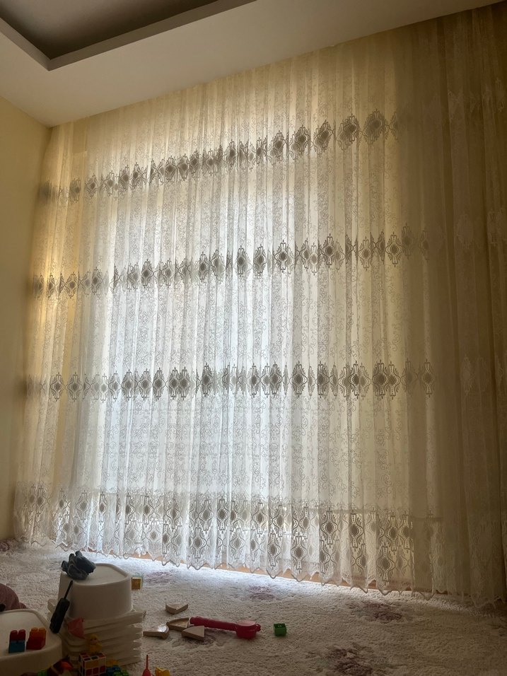 Beyaz renkli, hafif dantel desenli ve ince yatay detaylara sahip perde, yumuşak doğal ışık geçirir.