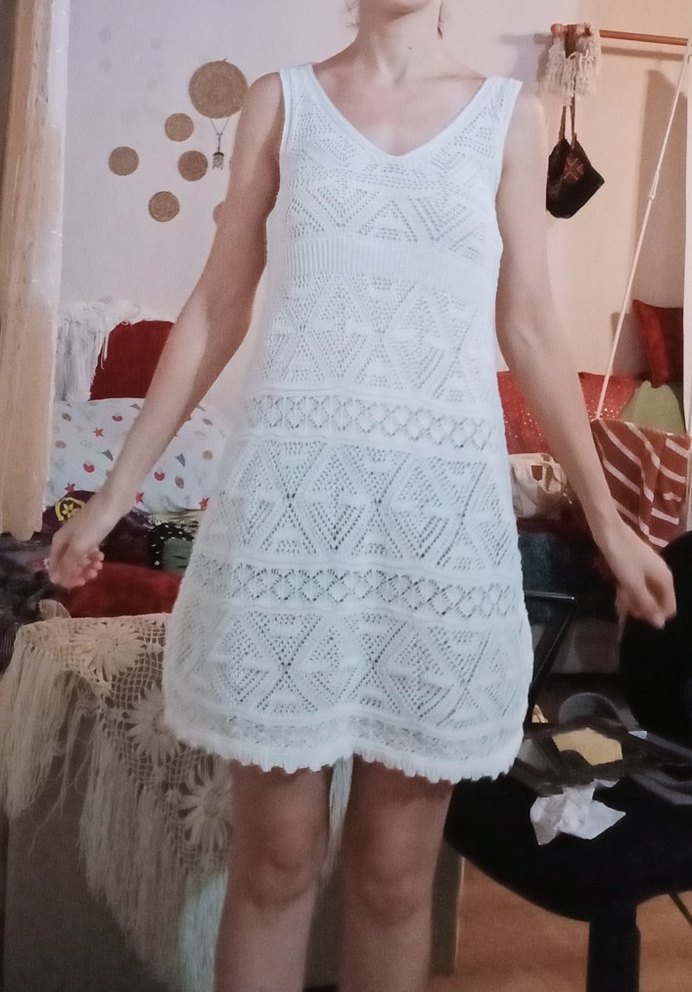 Beyaz renkte, dantel V yakalı kolsuz ve astarsız plaj elbisesi, diz üstü boyda, vücuda oturan kesime sahip. esnek kumamaş. uzunluk 66cm koltuk altı 40cm. Ambar marka ancak etiketi siyah siyah gözüktüğü için kestim