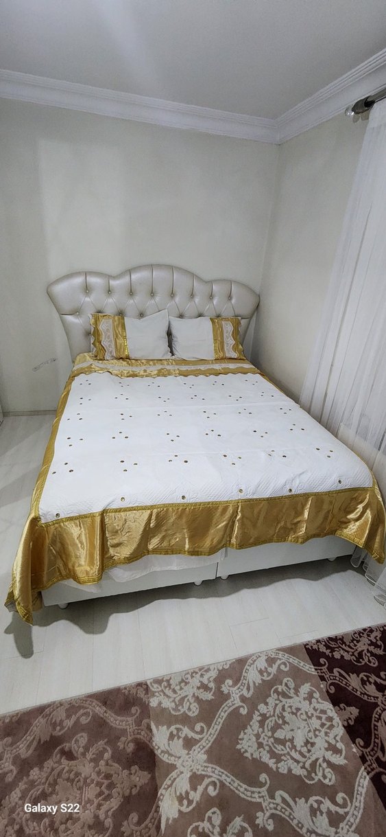 Beyaz dantel ve taş işlemeli pike örtüsü, parlak altın bordürler ve işlemeli detaylarla şık bir görünüm sunar. Uyumu sağlayan çarşaf ve yastık kılıfları dahildir. ️Hiç kullanılmamıştır.