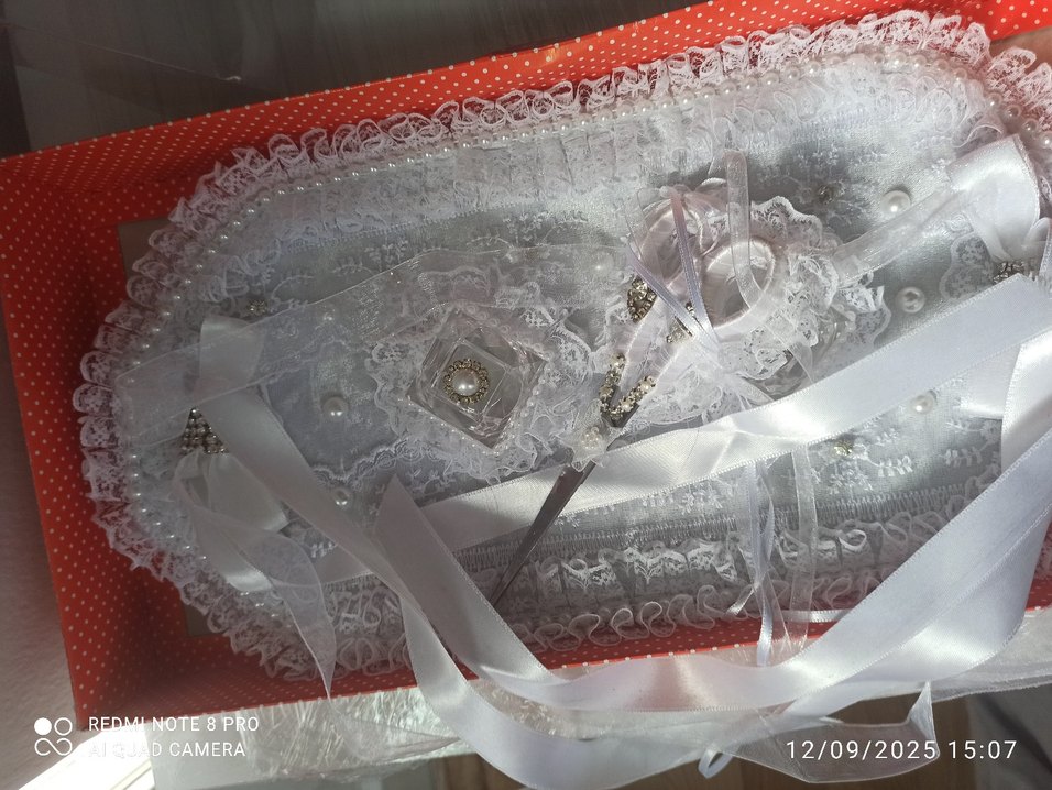 Klasik zarafeti yansıtan beyaz dantel, kurdele ve inci detaylı vintage düğün aksesuar seti. bir kere kullanıldı kusursuz hasarsiz