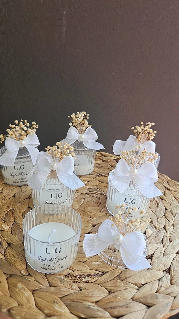 Şekerlik mum hediyelik. Beyaz dantel süslemeli, vintage bohem tarzda, kurdele ve kuru çiçeklerle dekore edilmiş klasik zarif düğün mumları. ️