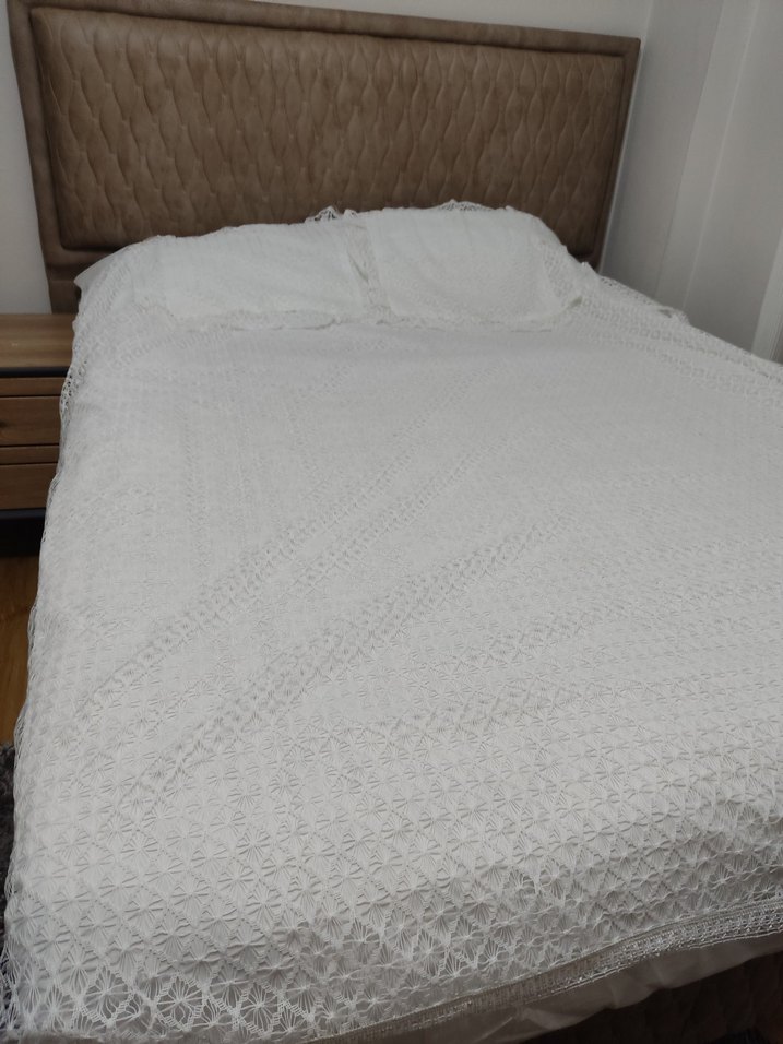 Yatak odanıza temiz ve sade bir görünüm kazandıran, hafif dokulu beyaz bir yatak örtüsü. ️teklife açığım gorseldekiler gelecek üç parça yastıklar ve tül örtü