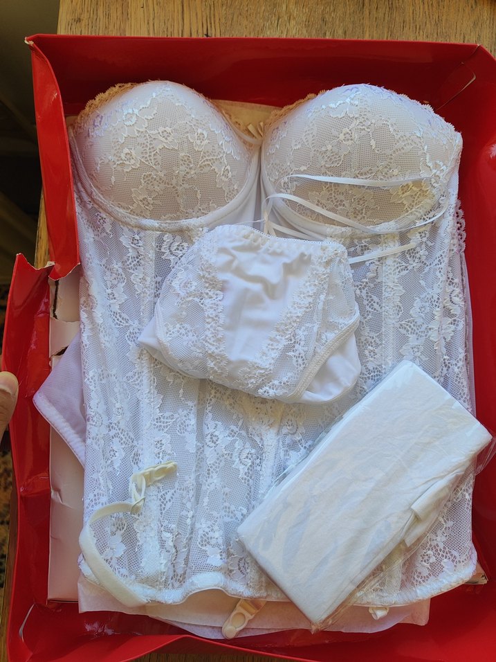 Beyaz dantel detaylı, ve vücuda oturan korsesi. Tam takım aksesuarlarla birlikte gelir. 85 beden alt beden L arkası ipli Hiç kullanılmadı.