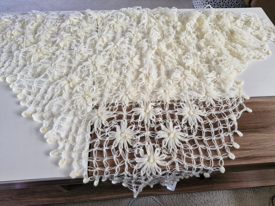 Bu beyaz kadın şalı, dantel ve örgü detaylarıyla hafif, bohem ve retro tarzını yansıtıyor. Hippie görünüm için uygun.