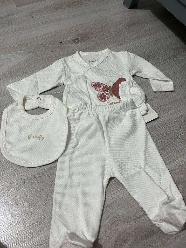 Uzun kollu kelebek baskılı dantelli üst, ayaklı pantolon ve önlükten oluşan yumuşak dokulu, açık renkli bebek kız takımı.