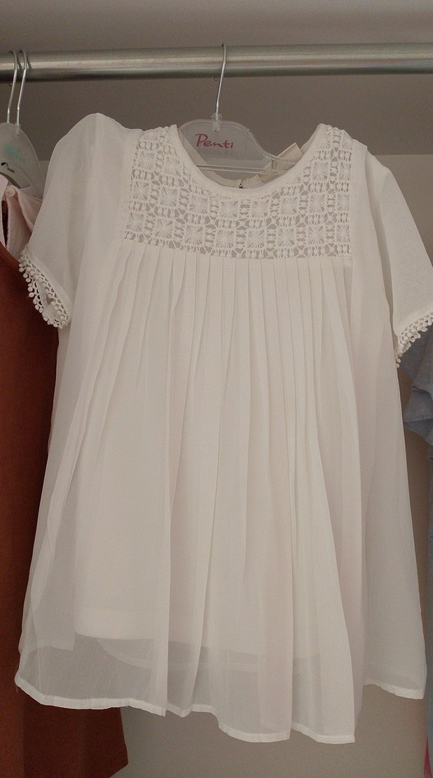 Beyaz renkli, kısa kollu ve dantel detaylı kız bluzu. Nakışlı yaka ve pamuklu kumaş ile bol kesim, bohem tarzına uygun.